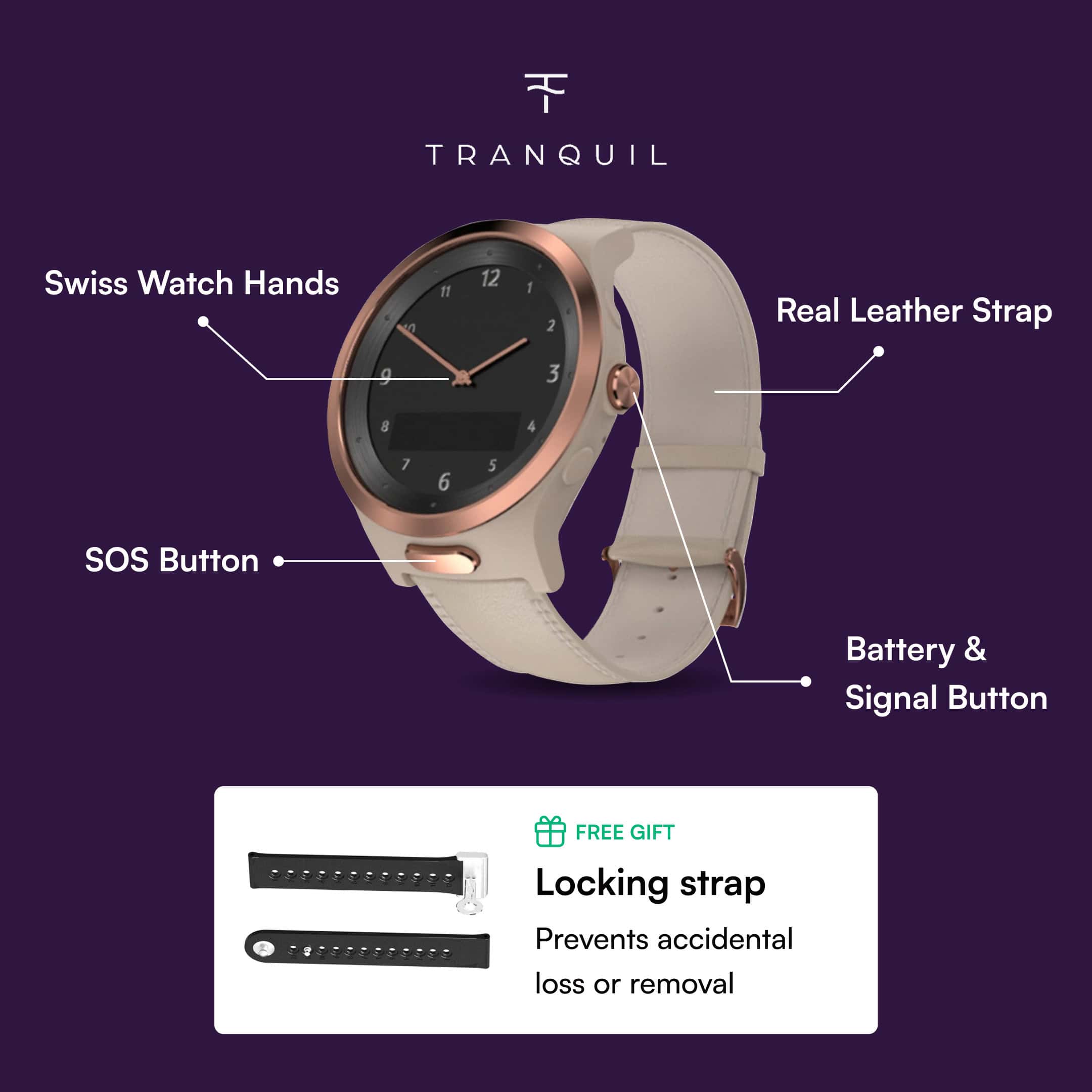 Locking strap – Prevents removal for dementia patients